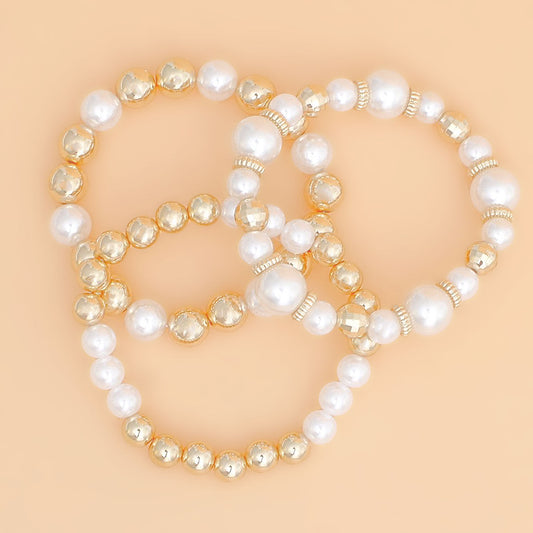 Bracelet Gold Bead White Pearl 3 Pcs Stretch Set