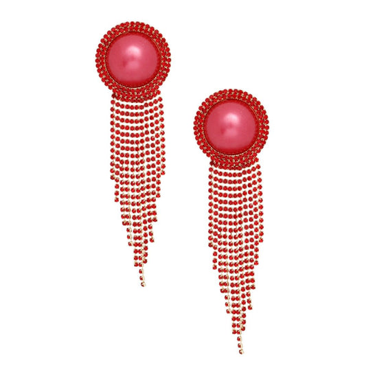 Clip On Red Pearl Dome Stone Fringe Earrings