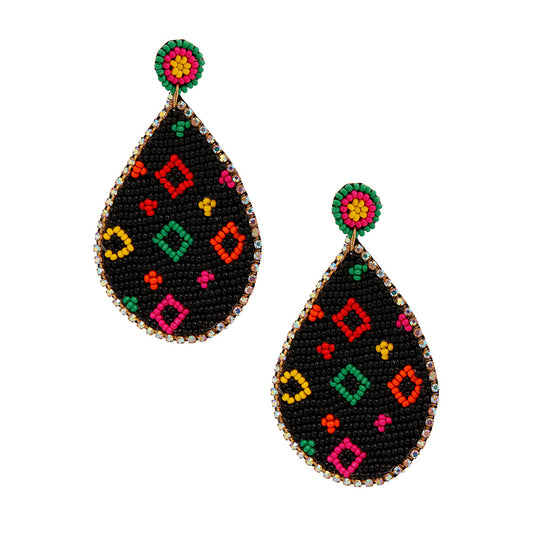 Embroidered Black Teardrop Bead Earrings