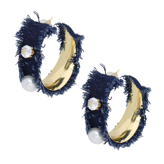 Hoop Gold Frayed Denim Pearl Rhinestone Earrings