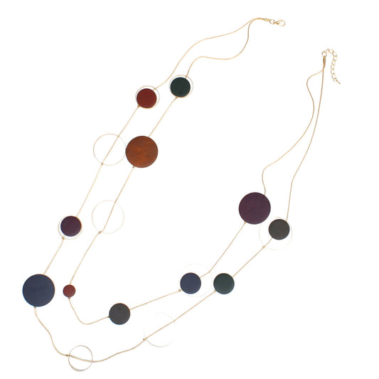 Long Multicolor Wood Disc Layered Gold Necklace