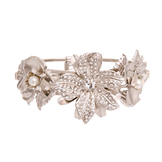 Rhinestone Floral Hinge Silver Bracelet