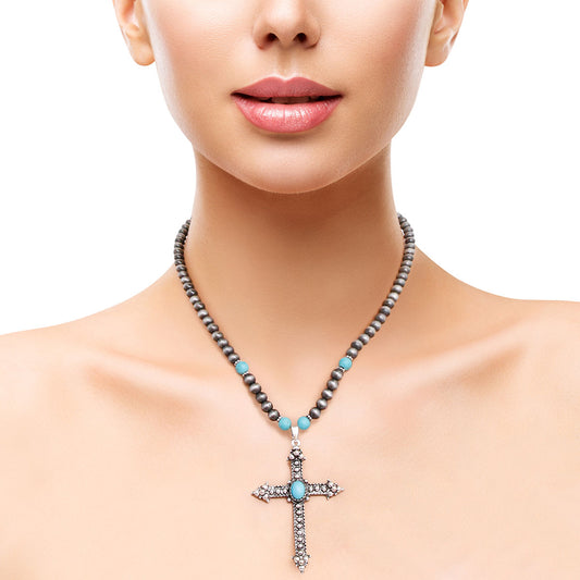 Turquoise Stone Silver Cross Necklace