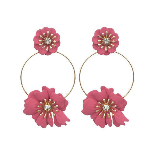 Dark Pink Coated Flower Drop Hoop Earrings