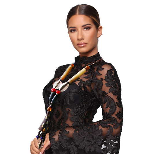 Multi Color Bead with Cowrie Shell and Brass Bib Necklace Set