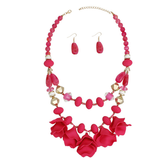 Beaded Necklace Fuchsia Petals Layered Set Women