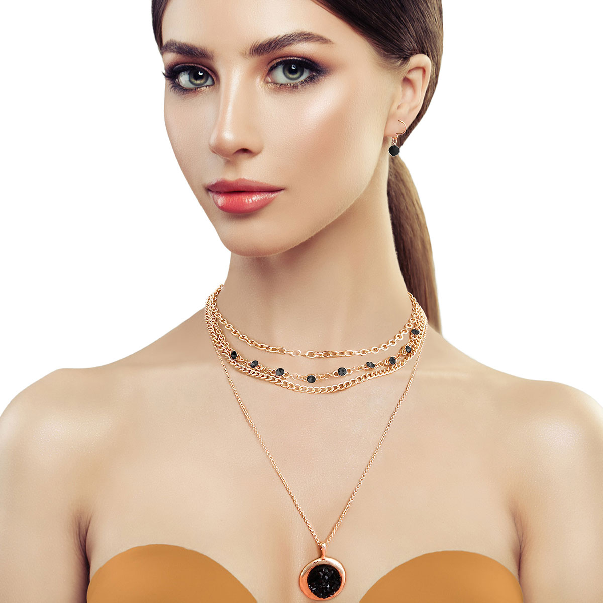 4 Strand Gold Metal Chain Necklace Set Featuring Black Glass Stone Detailing and Round Pendant. Pendant measures 1.5 inches long. Necklace layers measure 16" to 23"