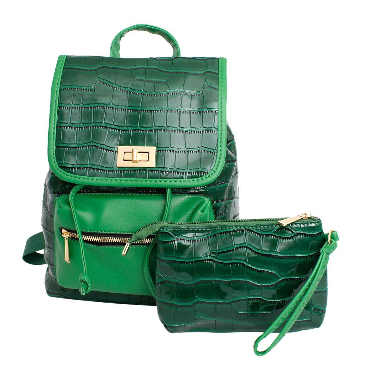 Women's Backpack Handbag Crocodile Texture Green Vegan Faux Leather Backpack Featuring Drawstring Closure with Flap and Twist Lock. Front Zipper Pocket. Includes Matching Wristlet with 2 Zipper Pockets measuring 5.25" x 7.75". Adjustable Canvas Shoulder Straps and Top Handle.