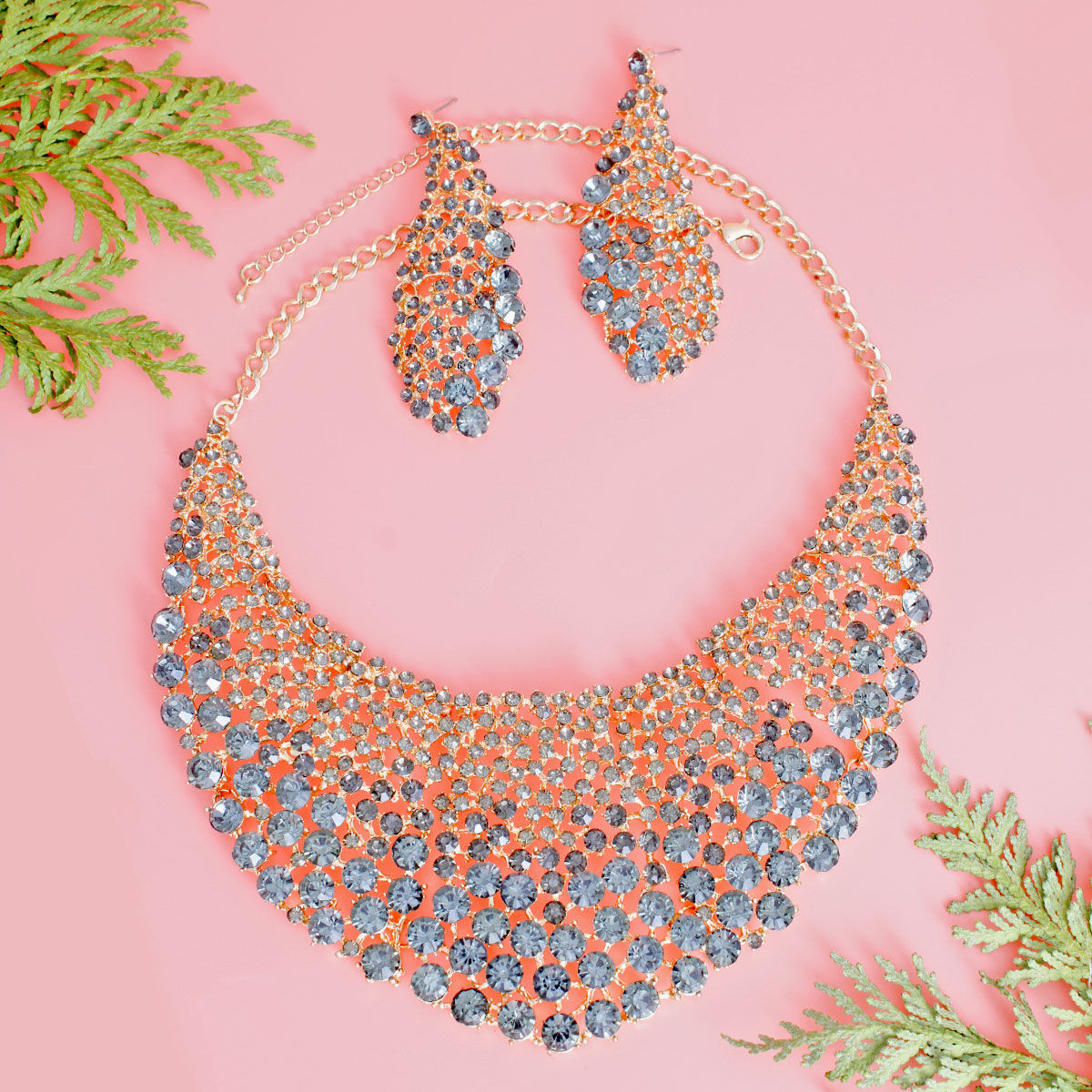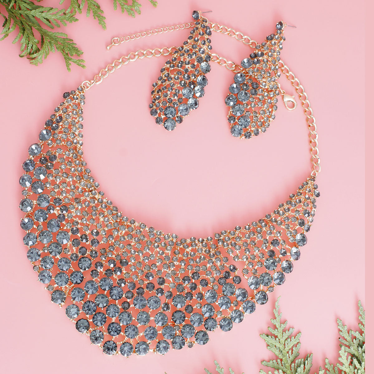 Gold Metal Bib Necklace Set Featuring Brilliant Black Diamond Round Cut Crystal Rhinestones. Bib measures 7 inches wide and 3.25 inches long. Matching Earrings measure 4 inches long. Rhinestones appear green in the light and look more black when not lit.