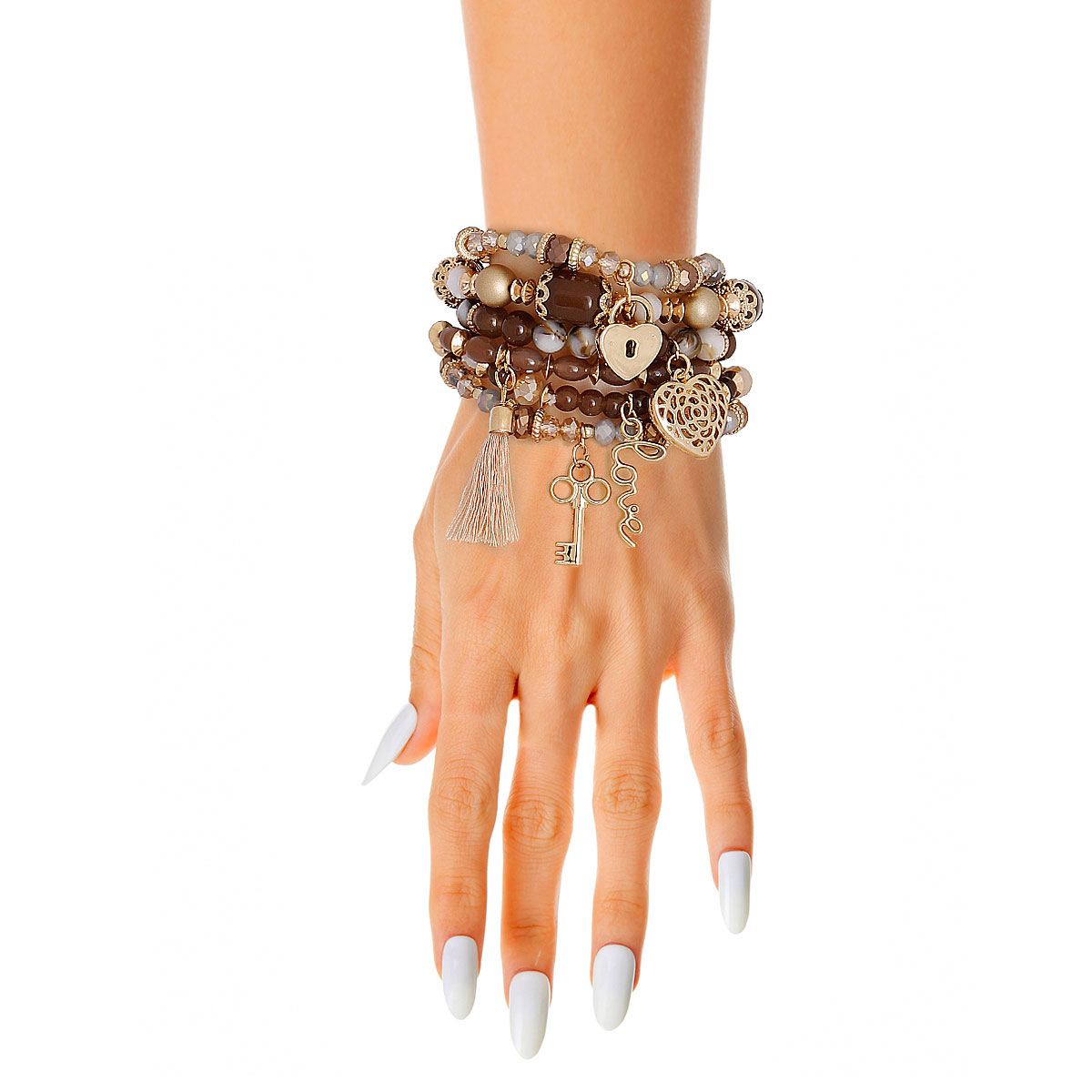 Gold and Brown Glass Bead Stretch Bracelet Set Featuring Love Charms and Tassel. 6 Pcs Set
