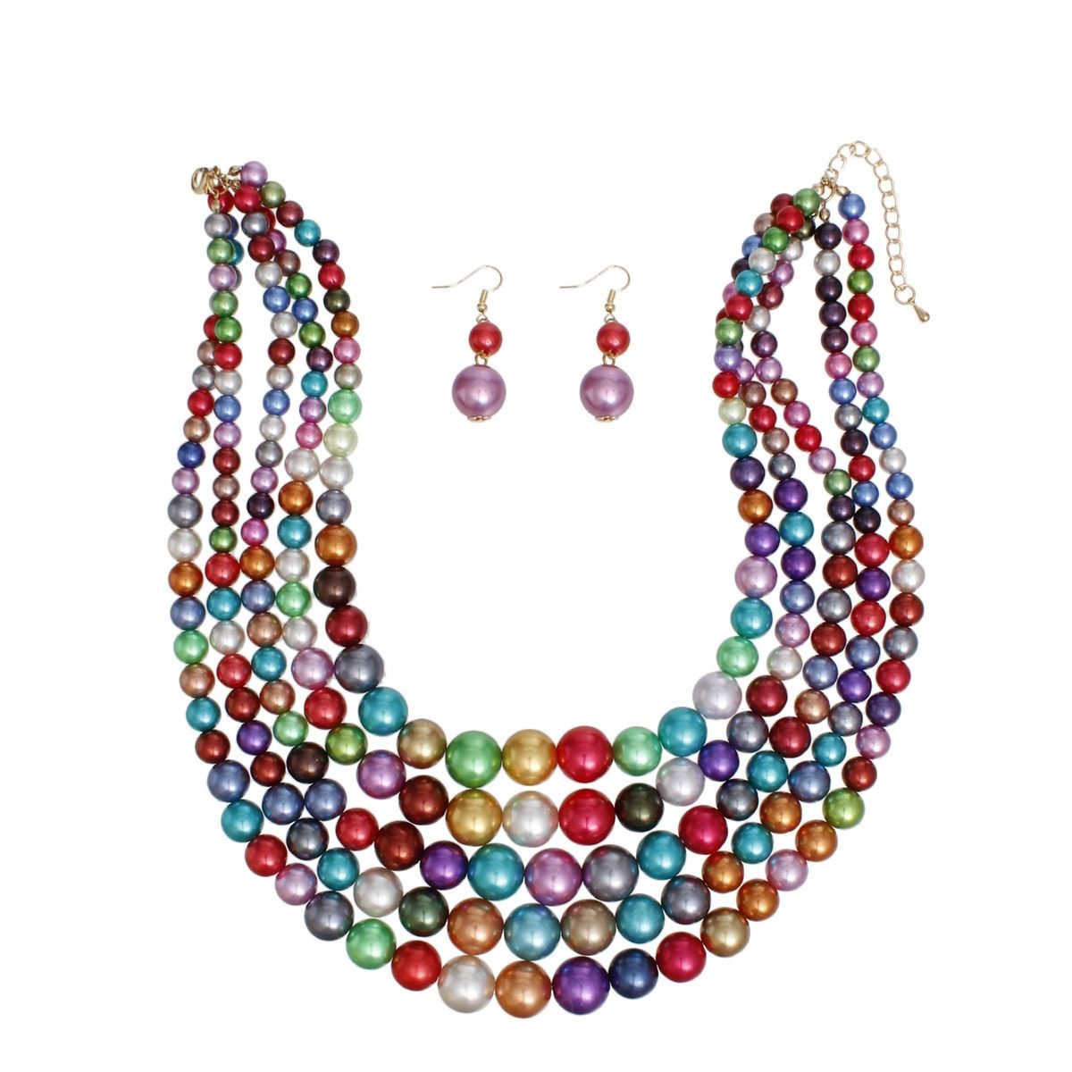 Women's Pearl Necklace Set. 5 Strand Graduated Acrylic Dark Multicolor Pearl Necklace Set. Gold Metal Lobster Clasp Closure. Includes Matching Fish Hook Double Pearl Drop Earrings.