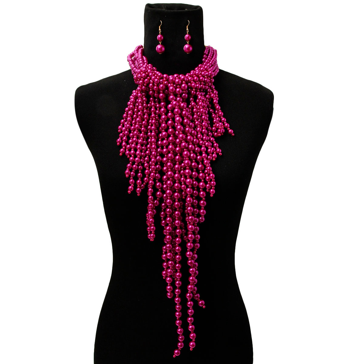 Gold and Clustered Fuchsia Pearl Necklace Set Featuring Long Pearl Fringe and Small Pearl Separator Detail. Fringe Measures 16 inches long