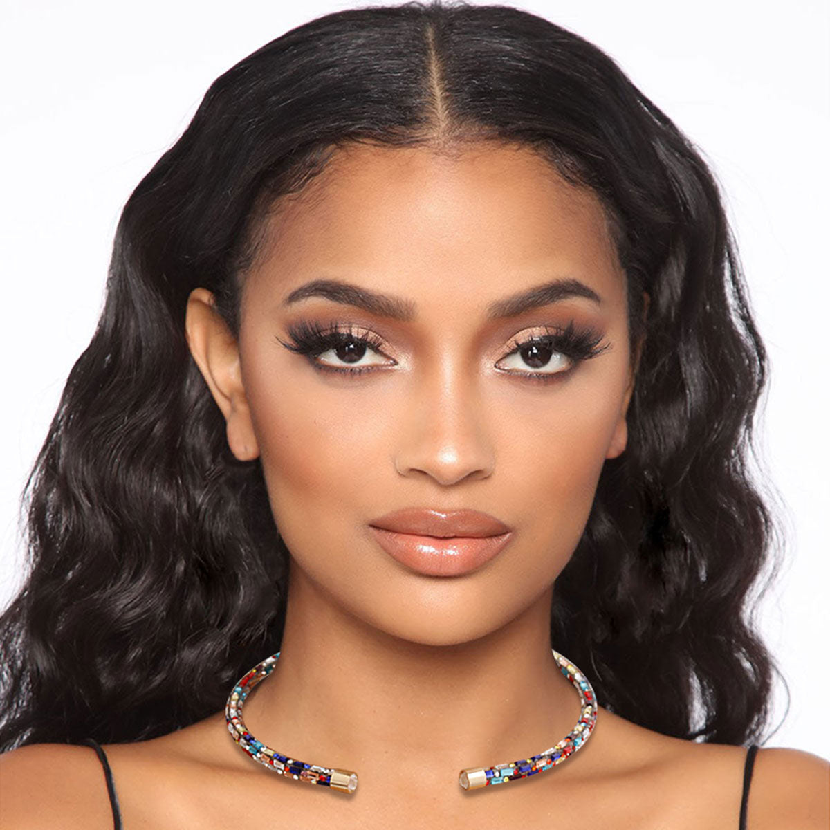 Gold Metal and Multi Color Crystal Rhinestone Tube Open Collar Choker Necklace