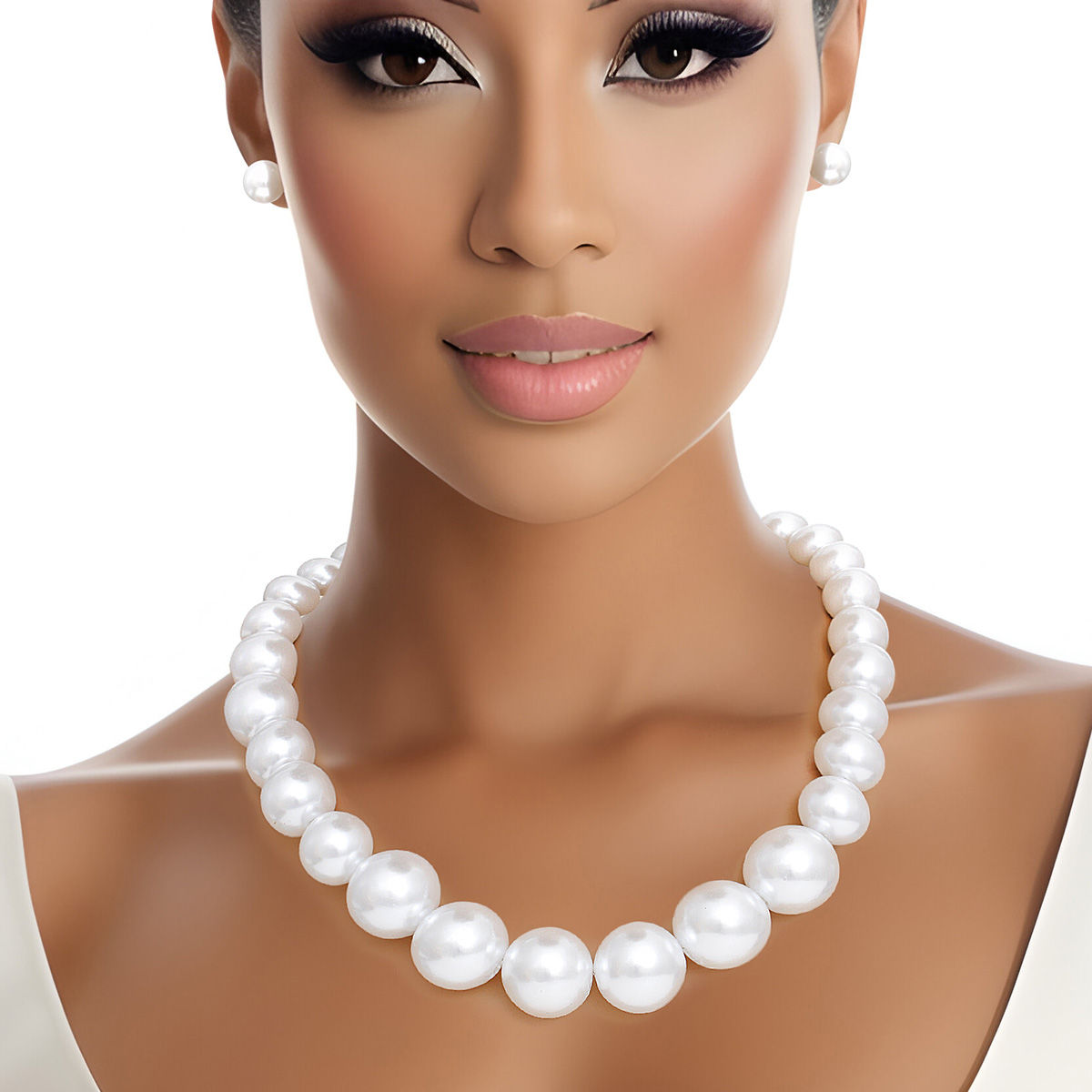 Women's Pearl Necklace Set Featuring Graduated White Acrylic Pearls. Silver Metal Lobster Clasp Closure. Includes Matching Pearl Ball Stud Earrings. Center Bubblegum Pearls measure 25 mm.