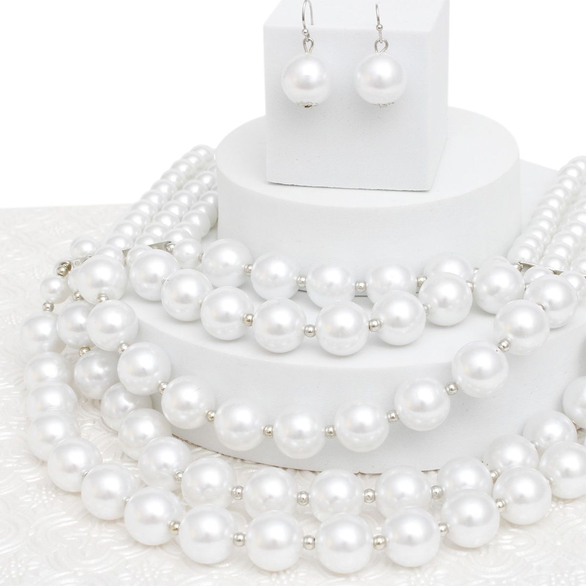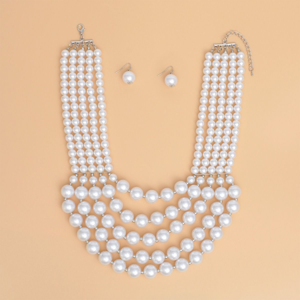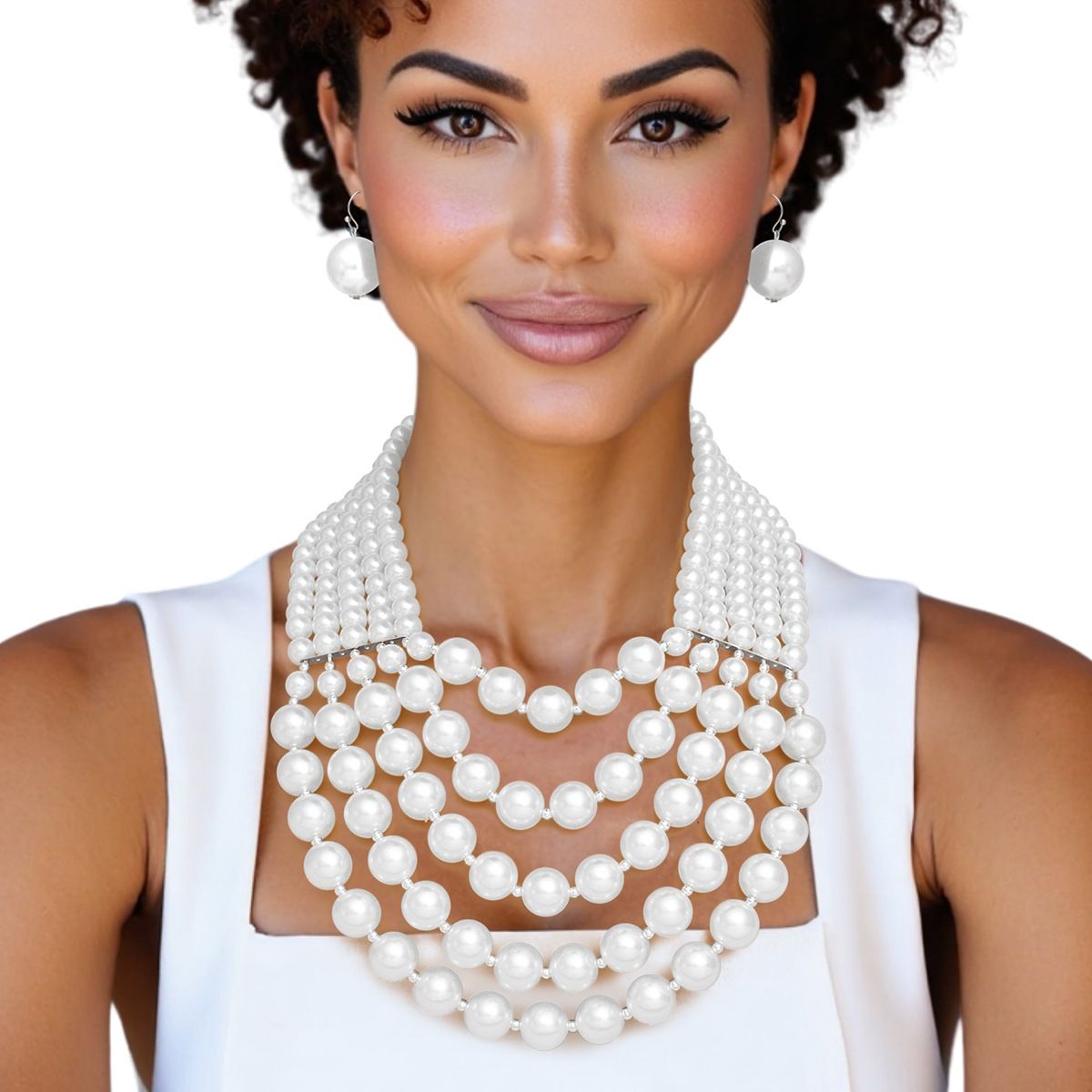 Women's Layered Pearl Bib Necklace Set. Delicately Draped Vintage 5 Row Acrylic White Pearl Necklace Featuring Silver Metal Hardware and Draped Pearl Bib with Silver Ball Bead Spacer Details. Draped Bib Portion Measures Approximately 3". Neckline Pearls Measure 10mm. Draped Pearls Measure 15.5mm. Lobster Clasp Closure. Includes Matching Pearl Drop Fish Hook Earrings.