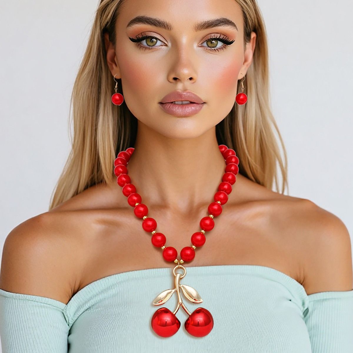 Women's Pearl Necklace Set. Sensual Cherry Drop Red Acrylic Pearl and Gold Ball Bead Necklace Featuring Pendant Comprised of Chunky Metallic Finish Double Cherry Drop with Polished Gold Acrylic Stem and Leaf. Pendant Measures 3" x 2.5". Neckline Pearls Measure 20mm. Gold Metal Lobster Clasp Closure. Includes Matching Fish Hook Drop Pearl Earrings. Coquette Cherry Girl Aesthetic.