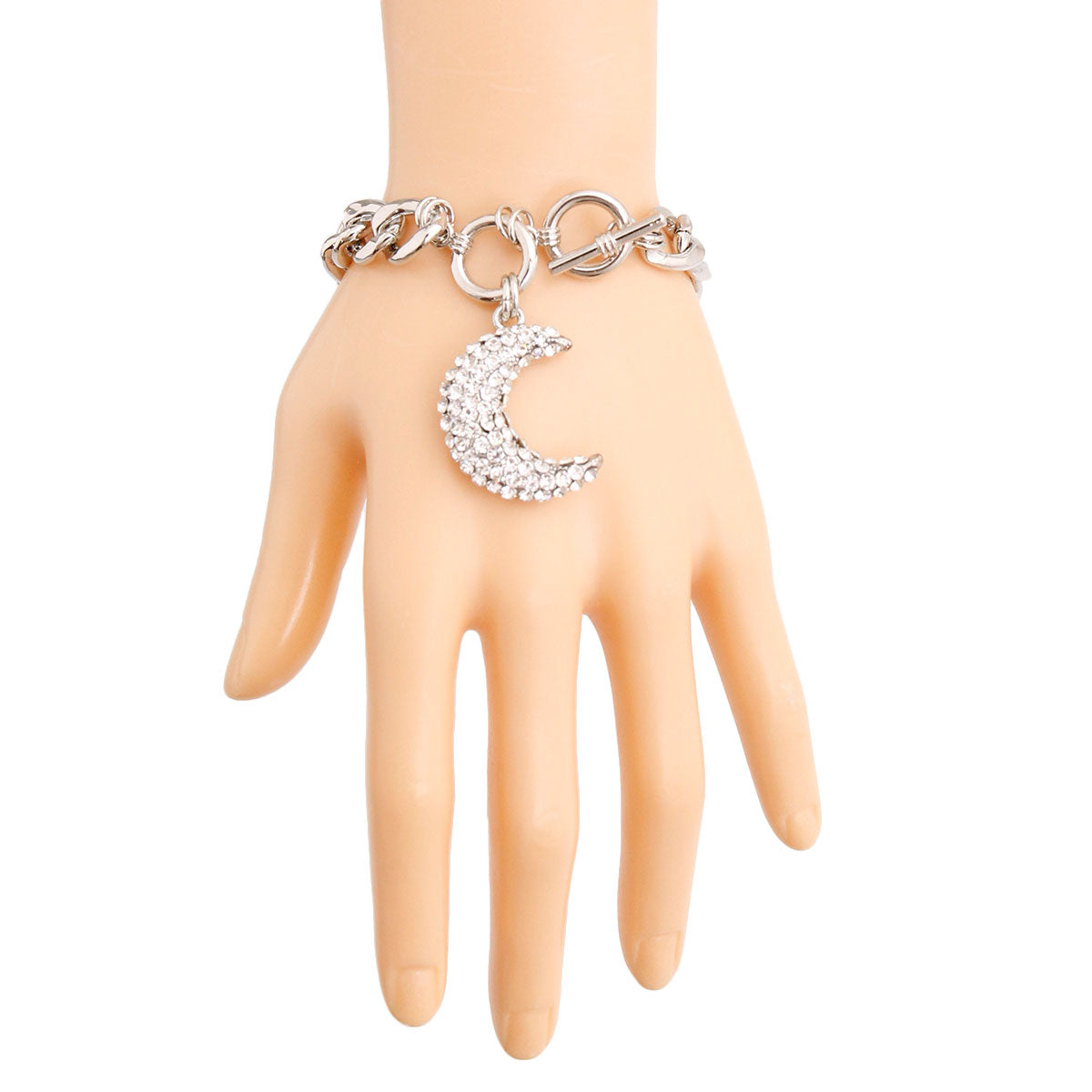 Silver Metal Chain Toggle Bracelet Featuring Clear Rhinestone Crescent Moon Charm. Charm measures 1.25 inches