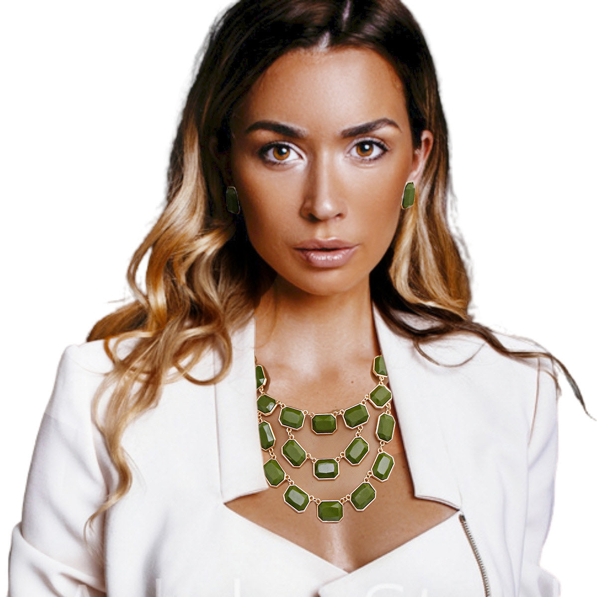 Gold metal chain necklace set with olive resin rectangle stones. Lobster clasp closure
