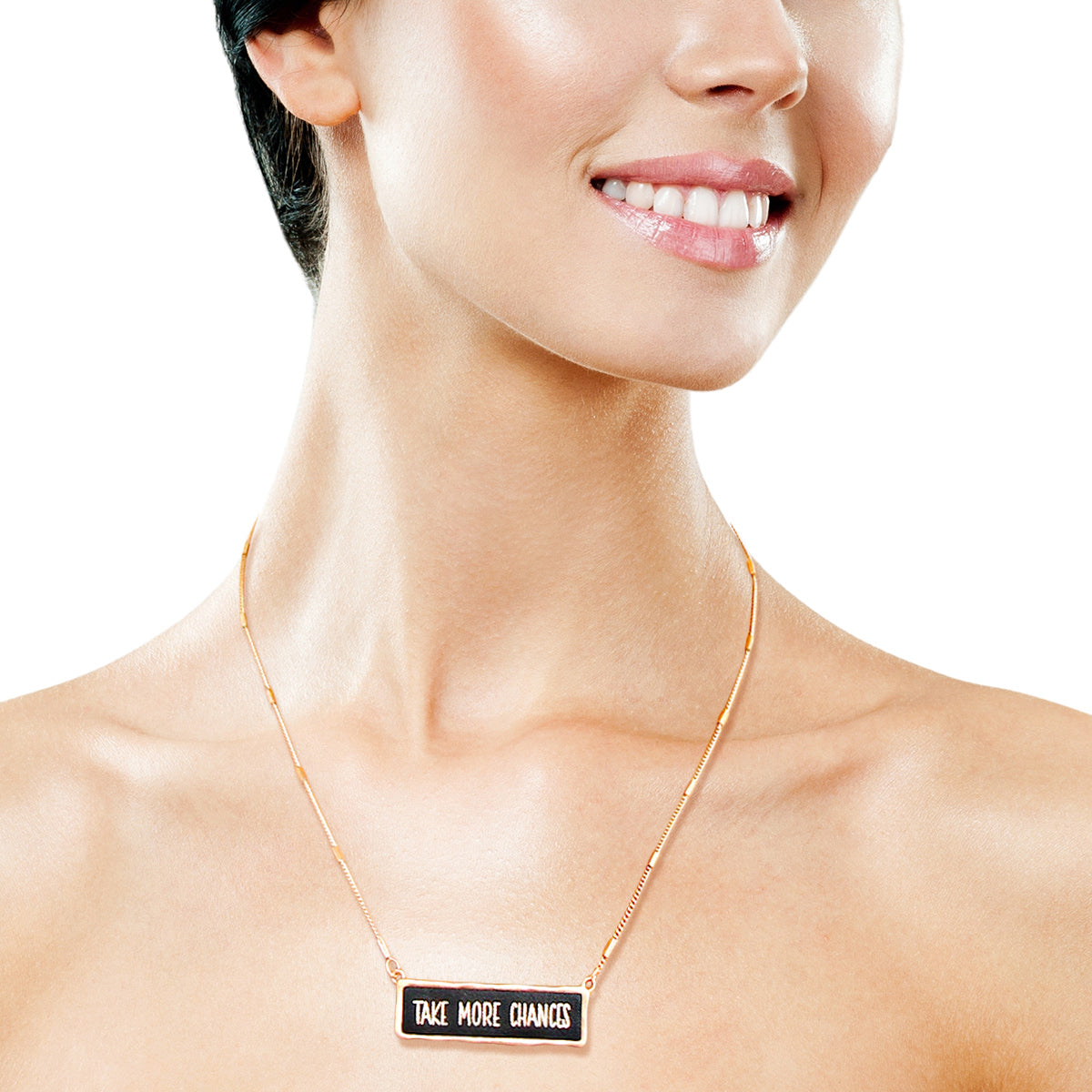 Gold Metal Chain Necklace Featuring Black and Gold Metal Plate Bar Pendant with TAKE MORE CHANCES Inspirational Detail. Pendant measures 1.65 x .5 inches