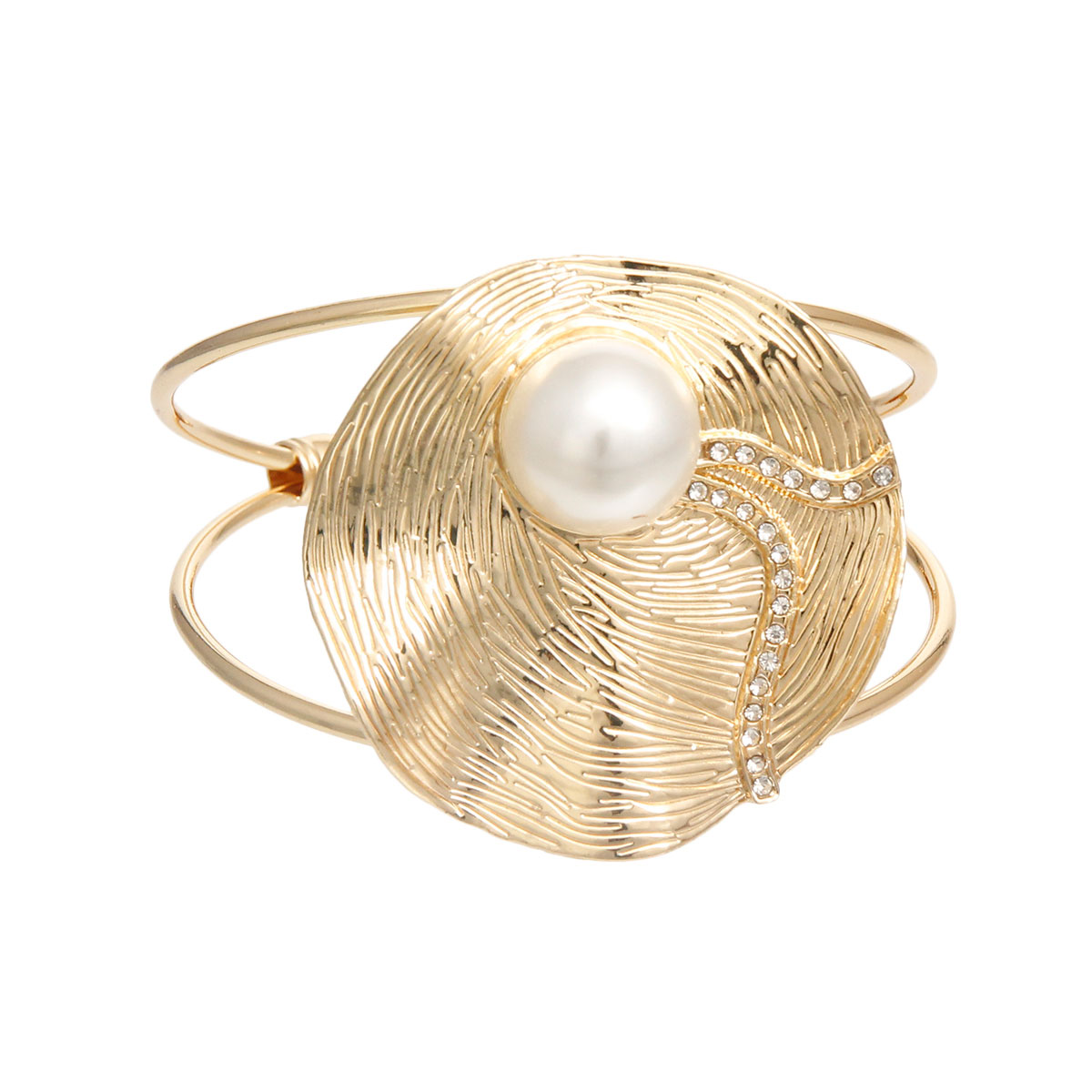 Gold Metal Cuff Bracelet Featuring Textured Metal Wavy Design with Cream Pearl and Rhinestone Detailing. 2 inches wide