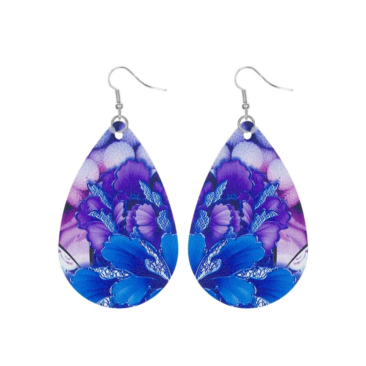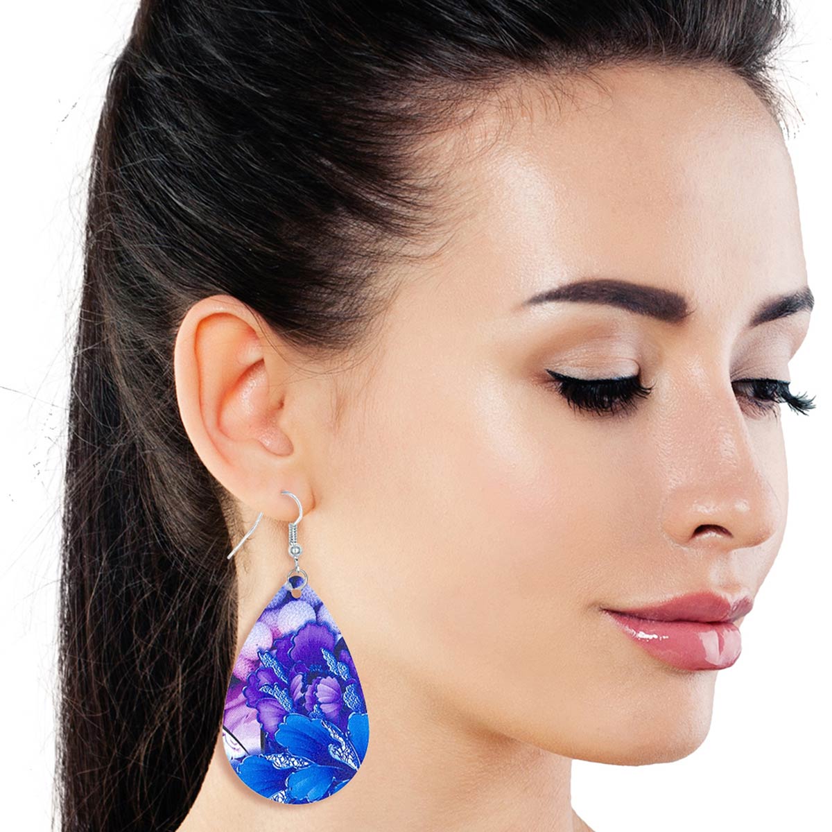Silver Metal Fish Hook Earrings Featuring Various Blue and Purple Flower Printed Vegan Leather Teardrop. Earrings measure 1.46 inches wide. **Please allow for variations in printed design.