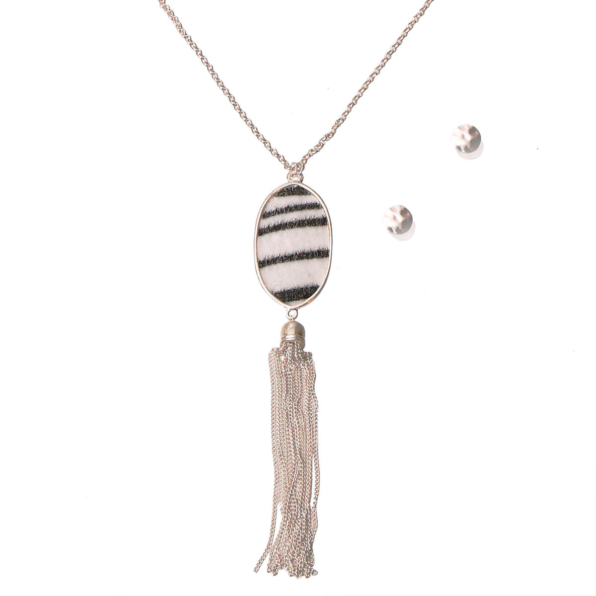 Long Silver Chain Necklace Set Featuring Oval Pendant with Zebra Print Fur Detail and Filigree Detail on Back with Tassel. Pendant measures 5.75 inches